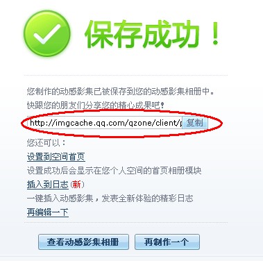 点击上图的确认后,就跳出如下保存成功的页面,然后该页面上的影集地址。