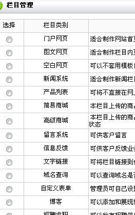 栏目类别的设置很重要的,你可以根据自己的要求来设置,最好多试试,正确设置栏目的类别对你今后方便管理网站是很有帮助的。如图:(按照建站类型不同,功能类型也不一样的)