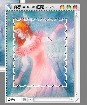 9、在邮票文档中,新建一图层,用自定形状工具在文档拖拉并产生邮票形状的路径,“Ctrl+Enter”转化路径为选区,“D”键复位前景及背景色,“Ctrl+Del”为选区填充背景色白色,“Ctrl+D”取消选区。