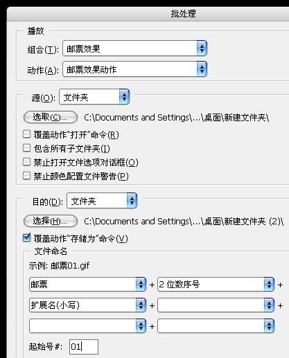 19、“文件――自动――批处理”弹出自动批处理对话框,选择动作组为“邮票效果”,动作为“邮票效果动作”;“源”文件地址选取你所需要改变的文件的文件夹地址;“目的”件地址选取你所需要存储改后的文件的文件夹地址,勾选“覆盖动作存储为命令”选项;在“文件命名”项内为改后的文件命名。具体设置可参考下图。(图7) 点选“好”开始动作的批量执行。
