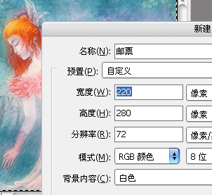 6、按着Ctrl键,双击灰色工作区域,新建一文件名为“邮票”,“220X280像素”大小的文件。“Ctrl+V”粘贴图象。(图2)